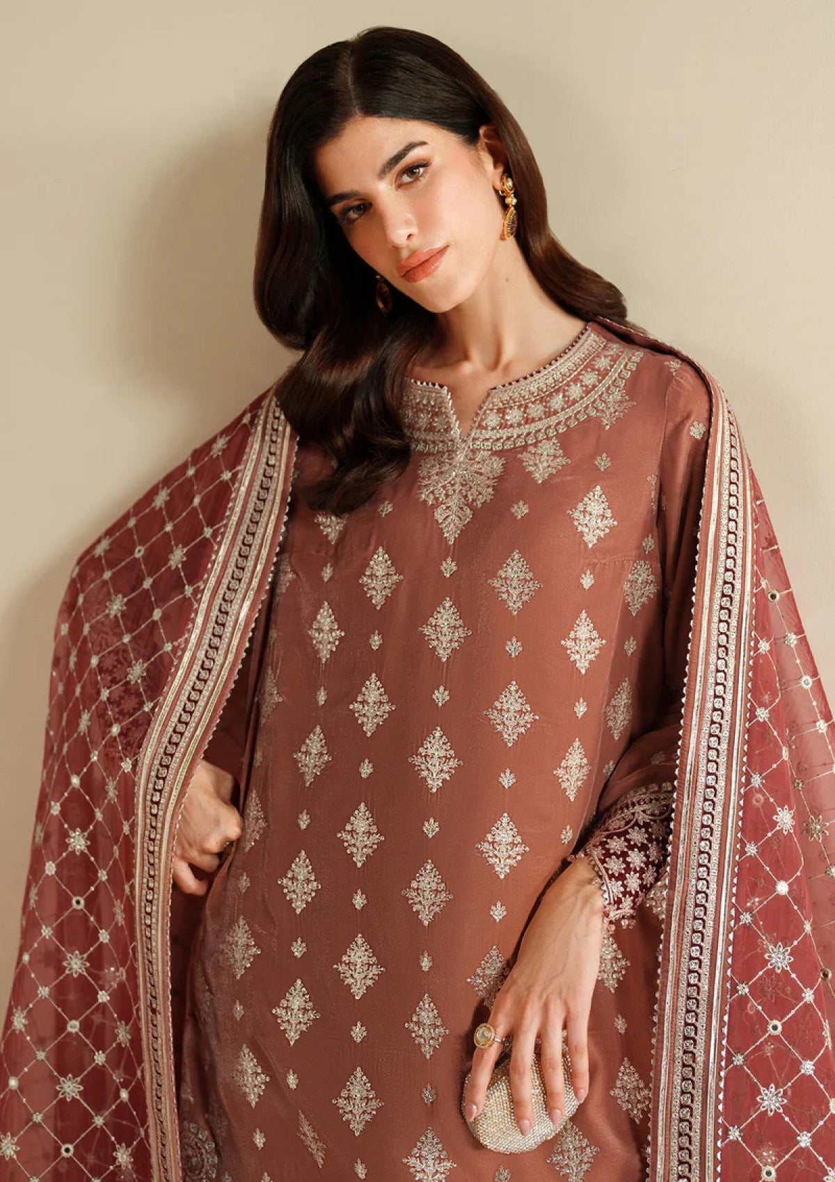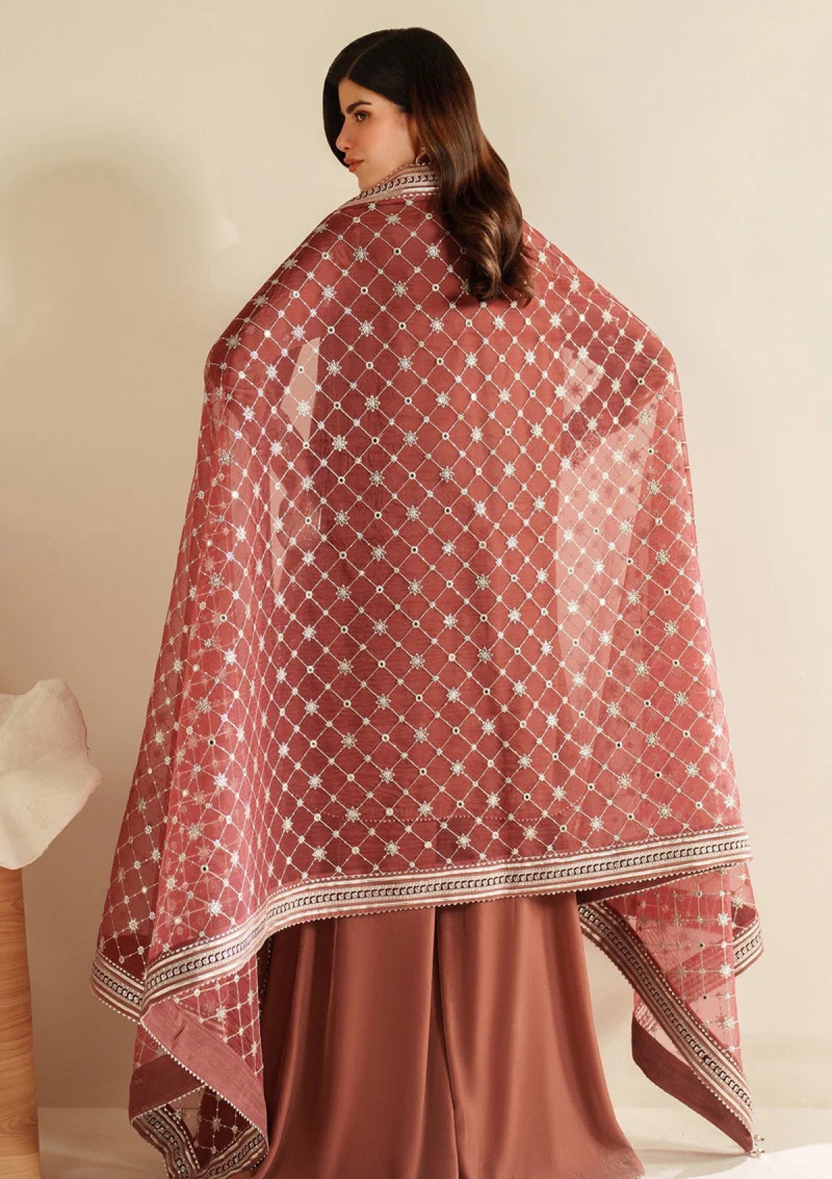 Crafted with rich pure velvet, this formal ensemble features intricate embroidery on the front, sleeves, and sleeve borders, showcasing refined craftsmanship. The dyed velvet back and bottom provide a cohesive, luxurious texture, while the embroidered organza dupatta and its velvet borders add an elegant, delicate touch. Perfect for formal occasions, this outfit blends sophistication with comfort through premium fabrics and detailed embellishments.