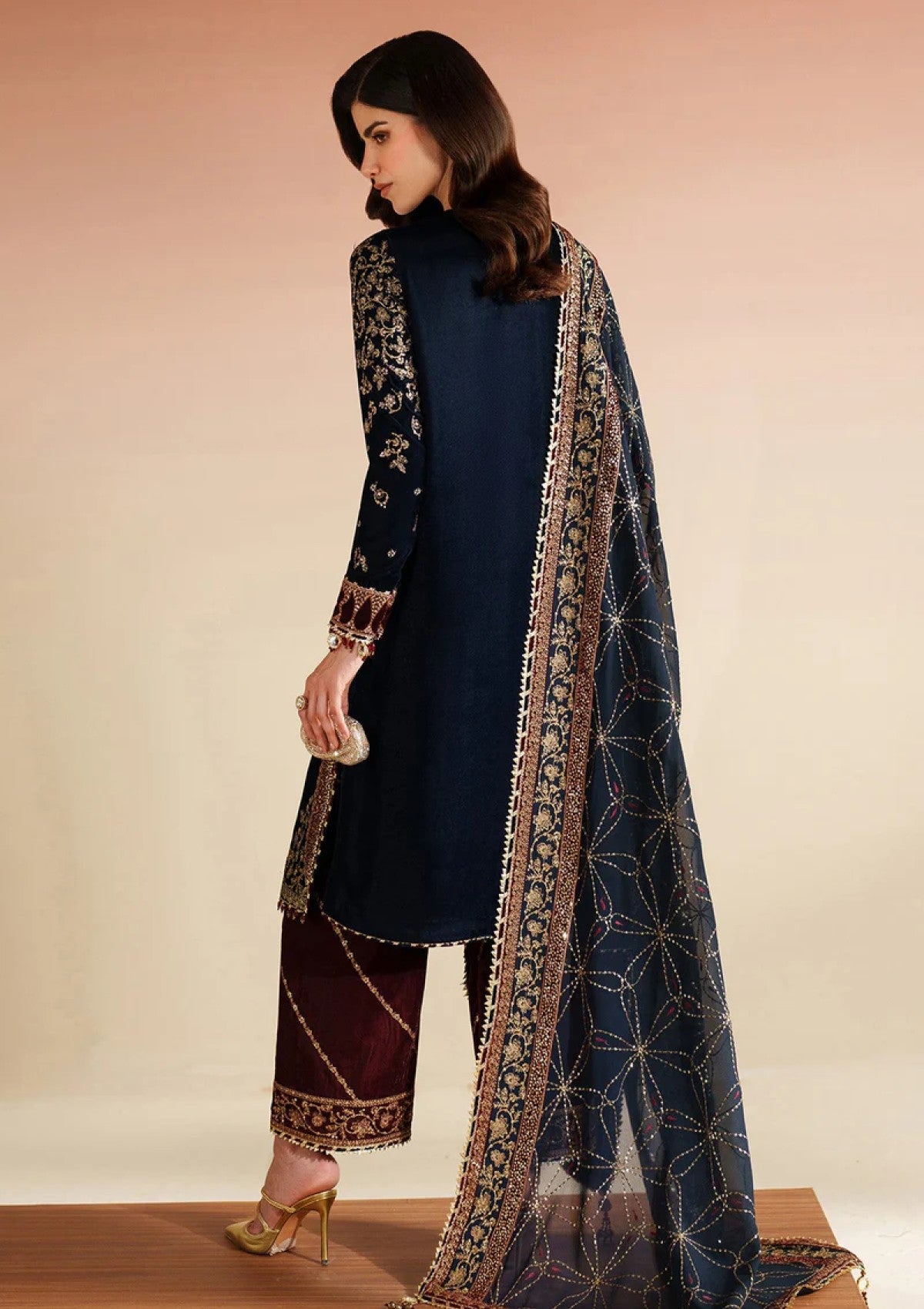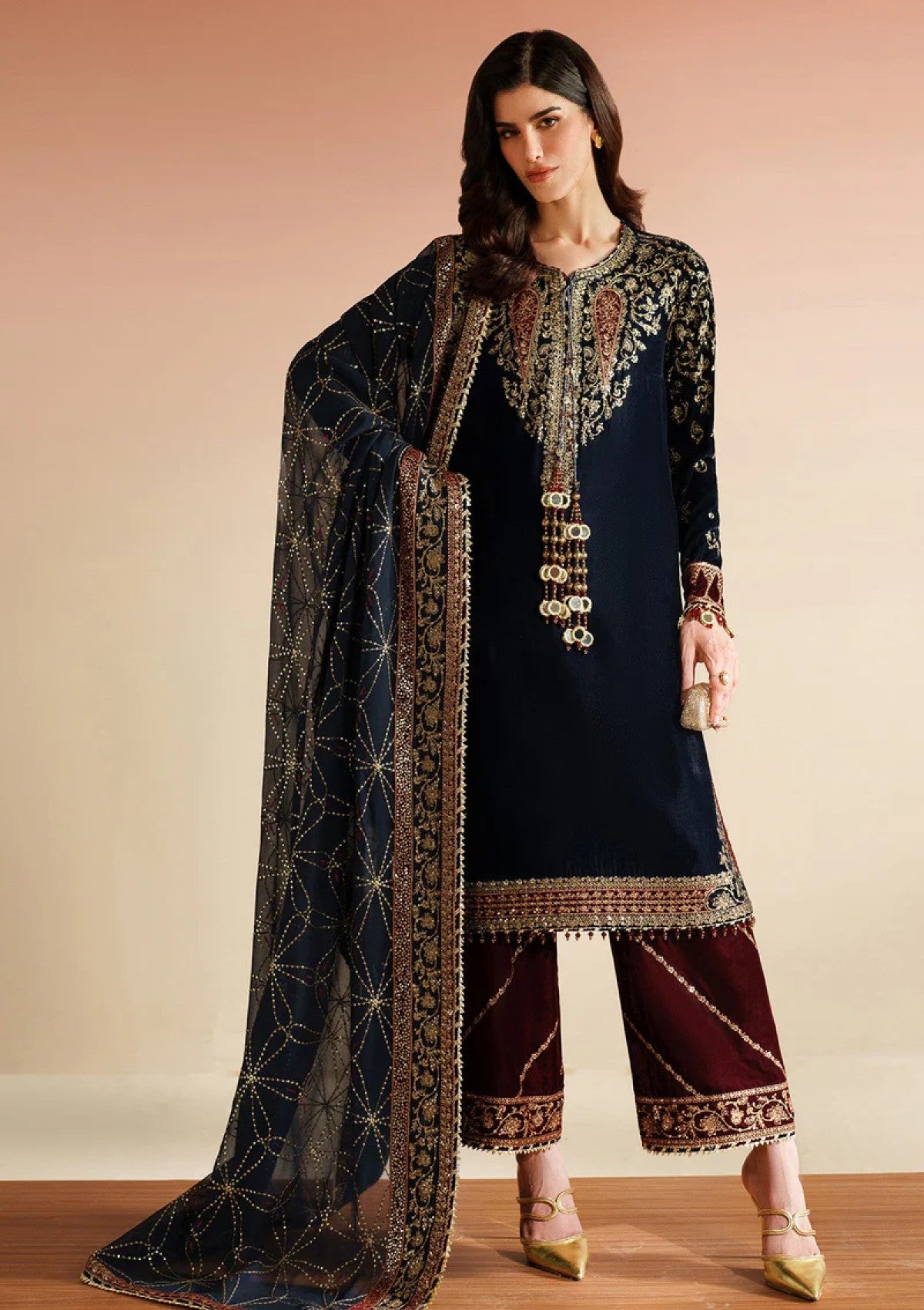 This luxurious formal ensemble features an intricately embroidered pure velvet front, sleeves, and borders on the front, back, and sleeves, creating a rich, elegant texture. The dyed pure velvet back complements the detailed bottom embroidery, enhancing the garment's sophistication. Completed with an embroidered georgette chiffon dupatta adorned with velvet borders, this outfit balances opulence and delicate craftsmanship for a distinguished formal look.