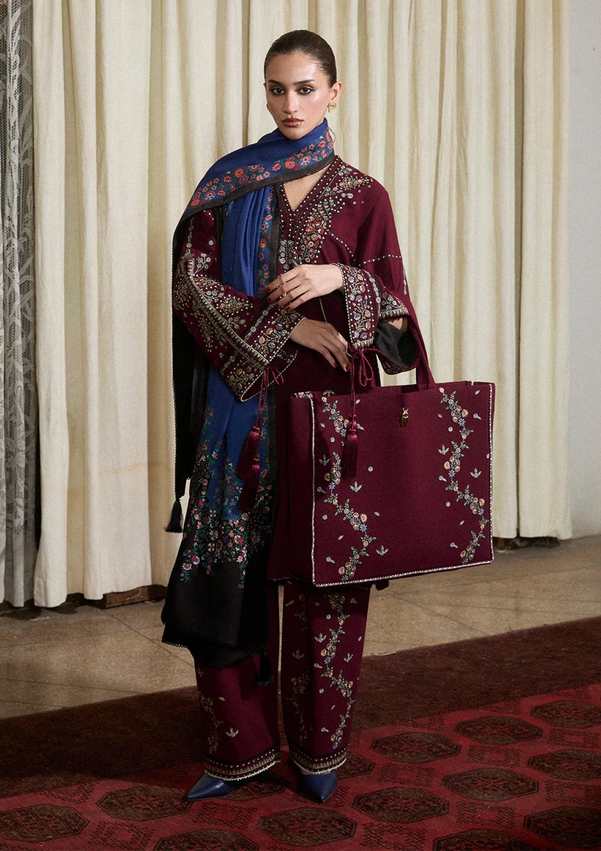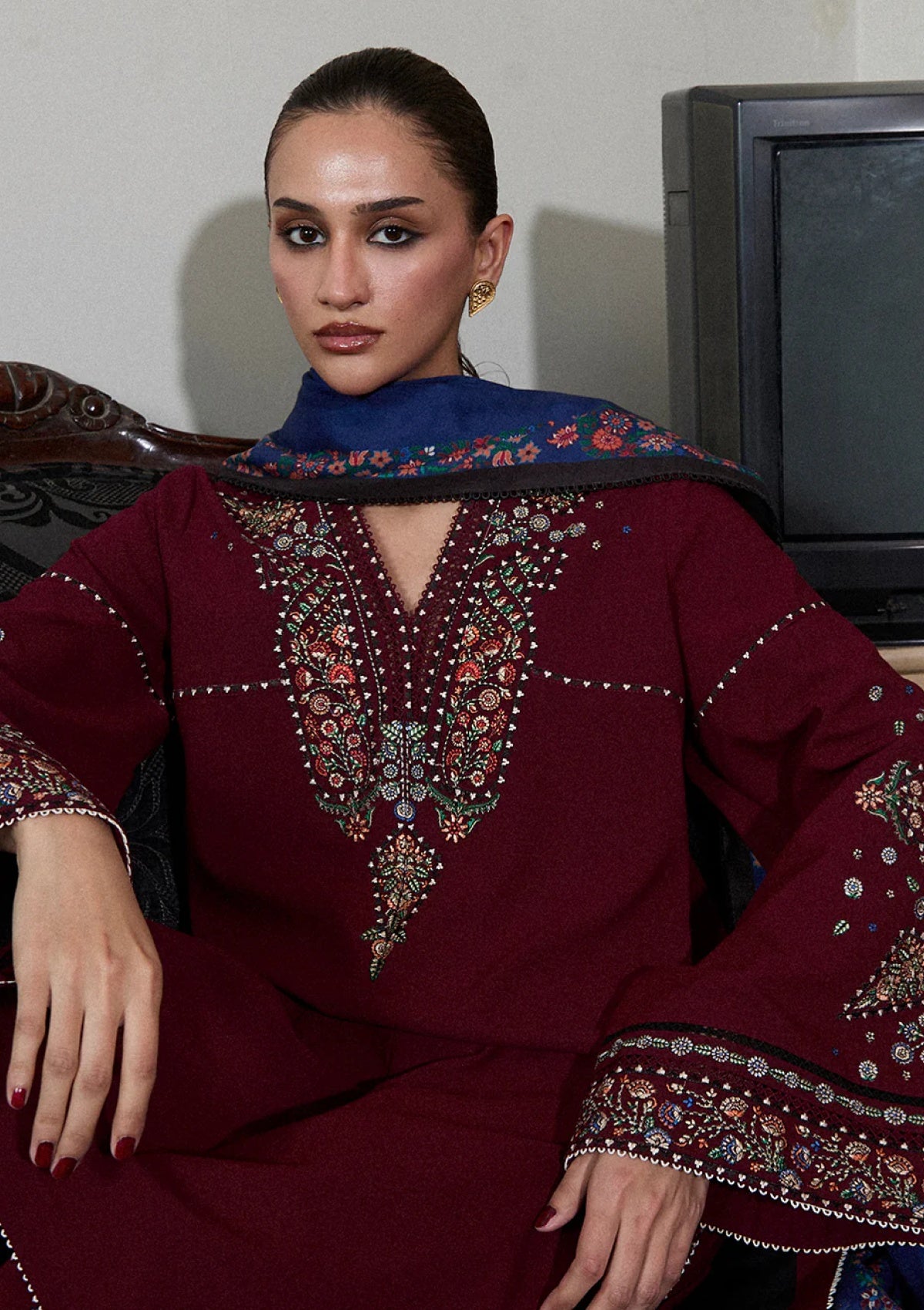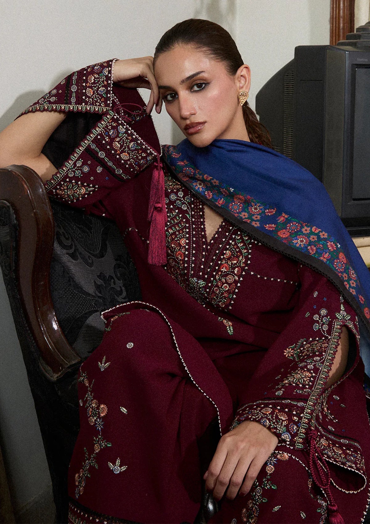 The ensemble features a maroon shirt adorned with intricate multicolor floral embroidery, exuding a timeless elegance. The sleeves mirror the floral motifs, creating harmony and refinement, while matching maroon shalwar continues the embroidered pattern, completing a cohesive look. The outfit is elegantly finished with a poly wool printed shawl, adding texture and a graceful traditional charm to the entire ensemble.