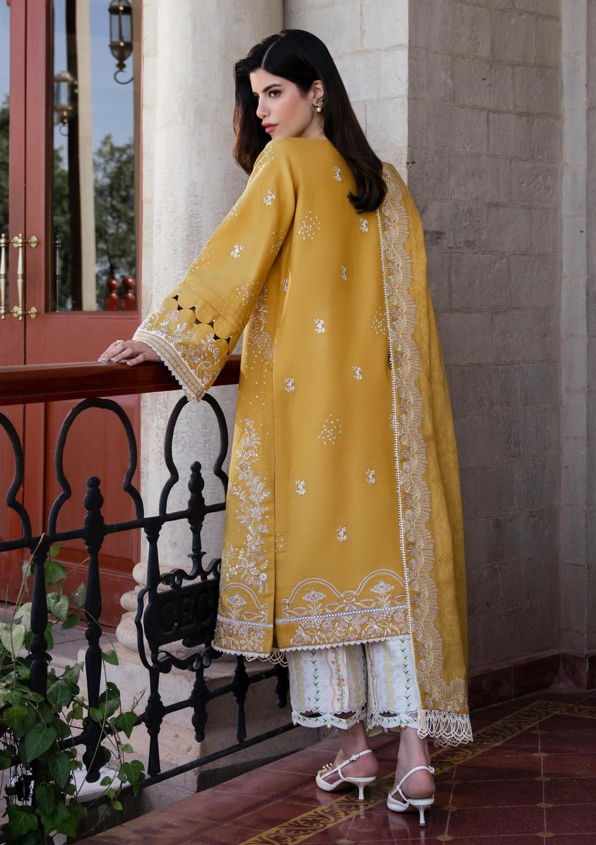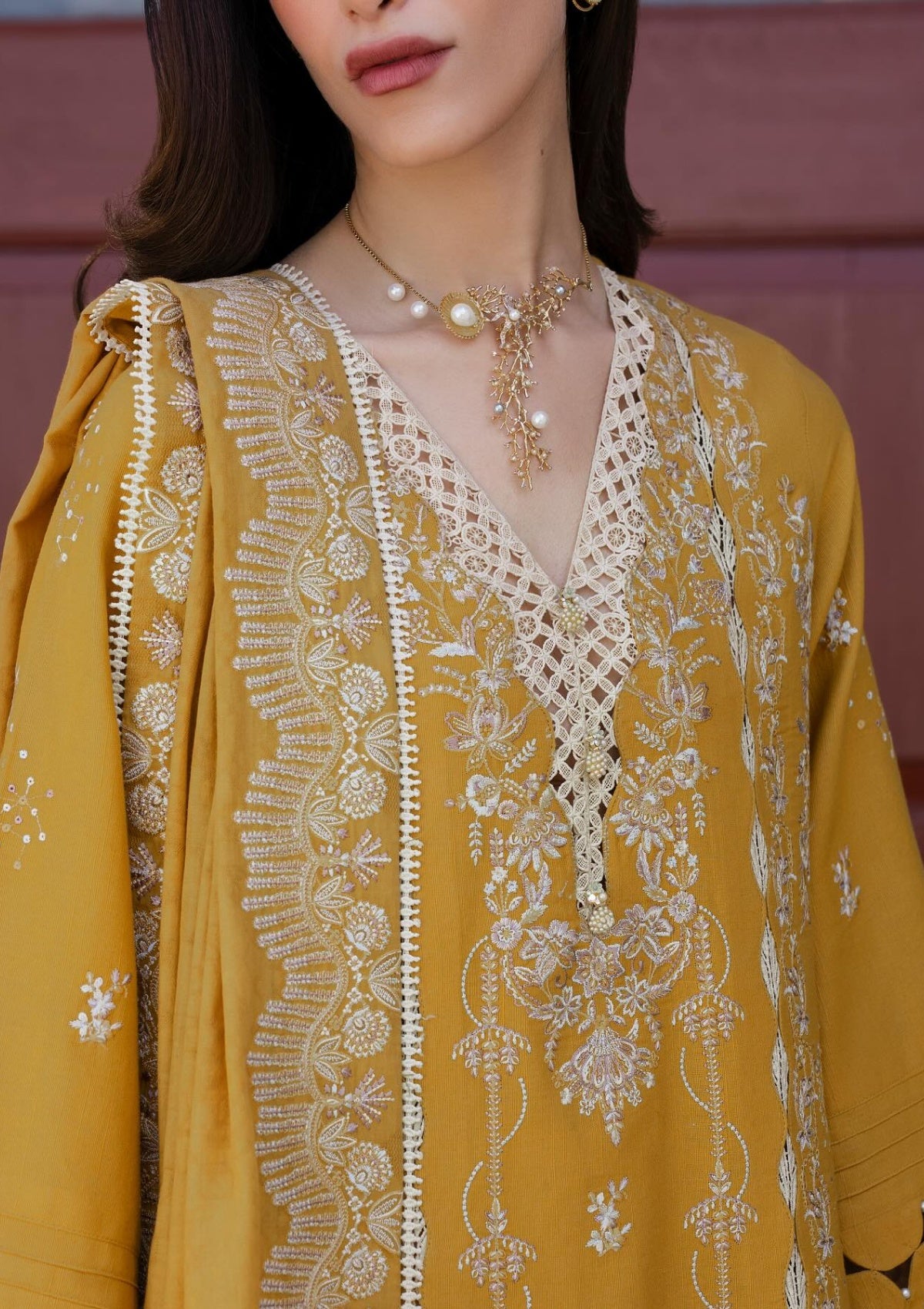 Brighten your winter wardrobe with this radiant mustard khaddar ensemble, exuding warmth and understated elegance. The shirt features white and self-colored embroidery, creating a refined balance of texture and charm. It is paired with white digital printed khaddar culottes, adding a fresh and contemporary edge to the look. A self-composed dobby embroidered dupatta completes the outfit, offering depth and sophistication. Perfect for casual gatherings or daytime festivities, this ensemble captures effortless grace with a modern appeal.