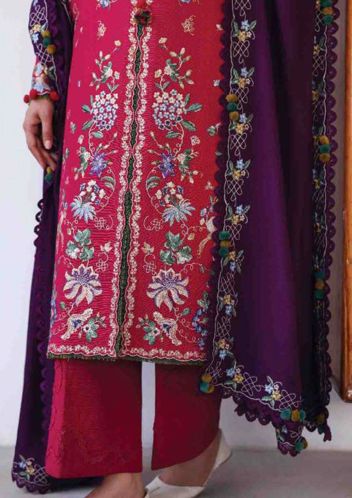 This front-open khaddar shirt is adorned with satin stitch floral embroidery in vibrant shades of blue, green, yellow, and white, creating a lively and elegant design. It is paired with a purple twill marina shawl featuring four-sided colorful floral embroidery, perfectly complementing the shirt for a harmonious and sophisticated winter ensemble.