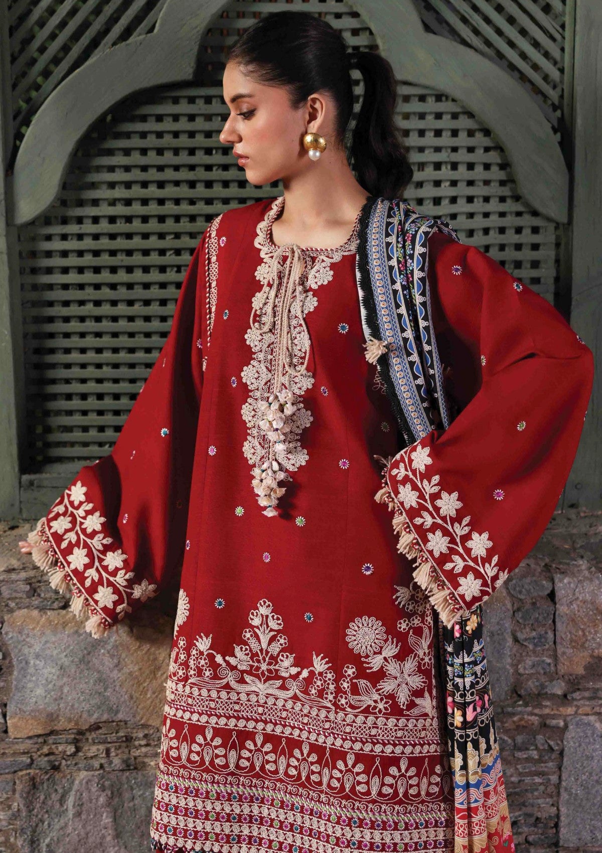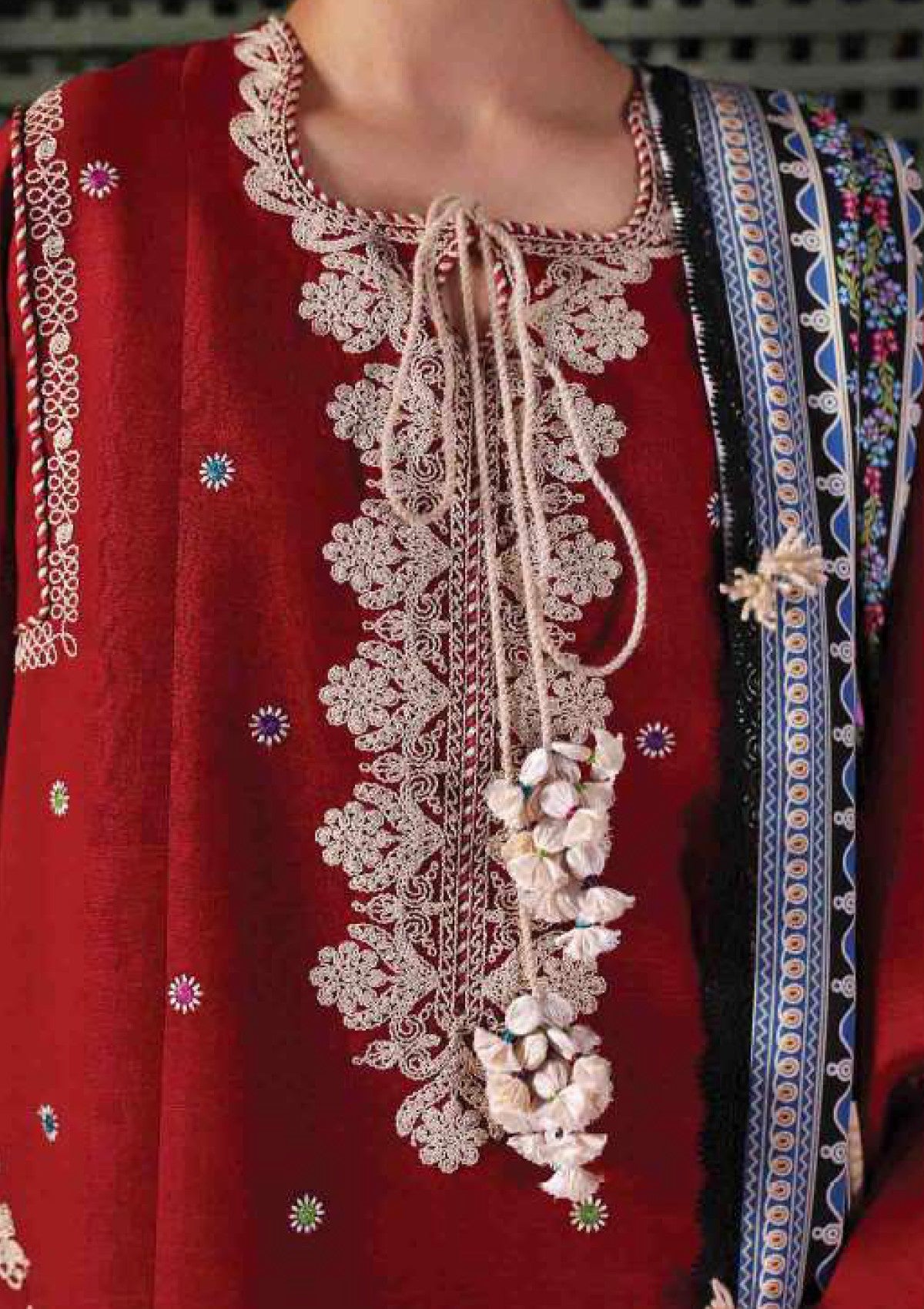 This deep red shirt is beautifully adorned with cream Dori embroidery on the front, creating a striking and elegant contrast. It is paired with a black base printed twill marina shawl featuring vibrant colors, adding a lively and complementary touch to the ensemble.