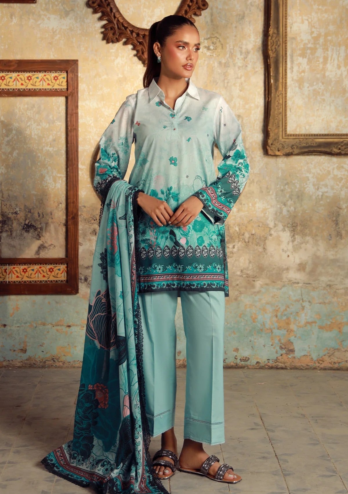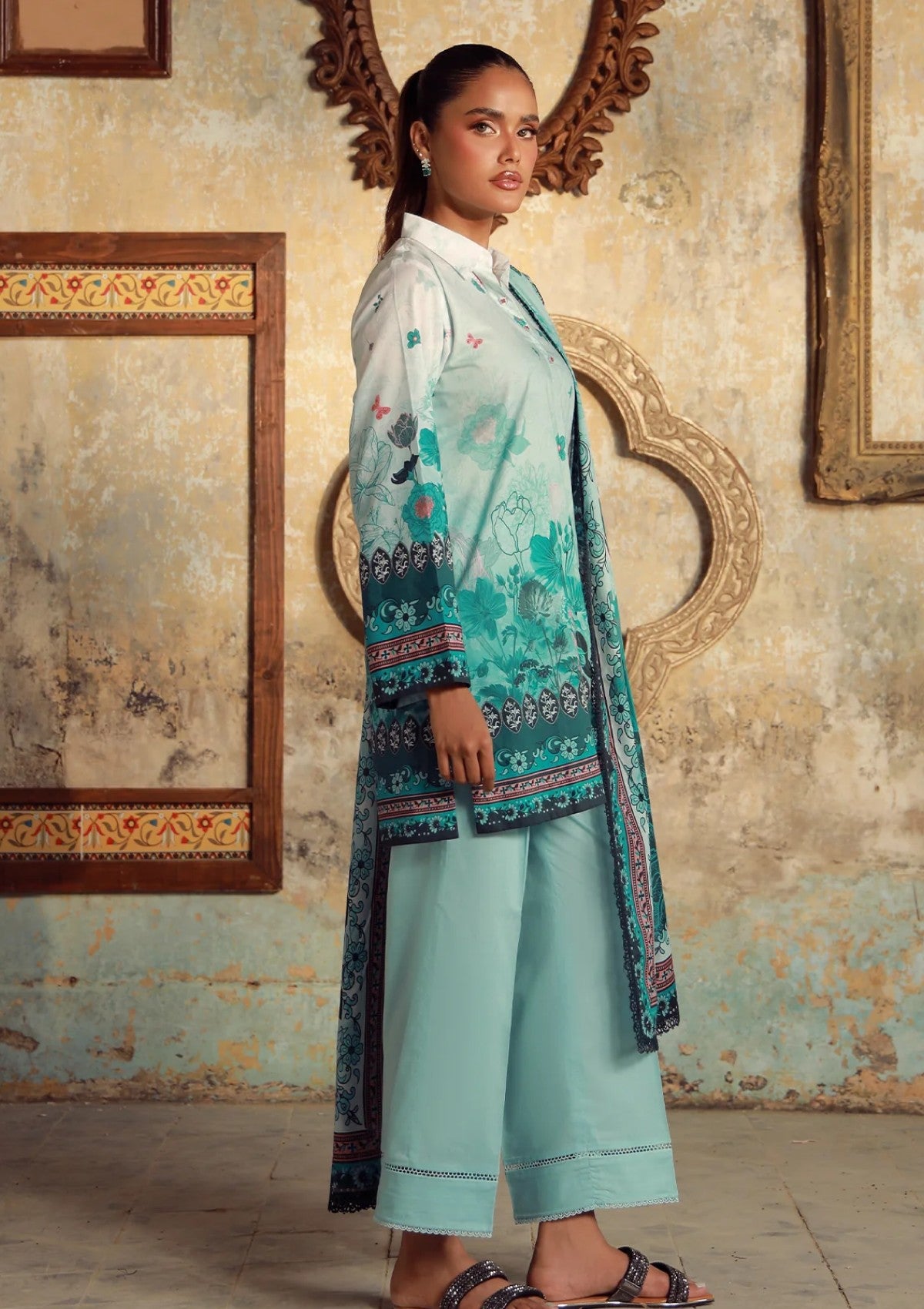 A refreshing ensemble in aqua and light teal tones, capturing the essence of cool elegance. The shirt features intricate floral and ornamental print borders on the hem and sleeves, balanced with delicate scattered motifs on the upper body. Styled with solid aqua trousers and paired with a printed dupatta, this outfit is a graceful blend of tradition and contemporary charm.