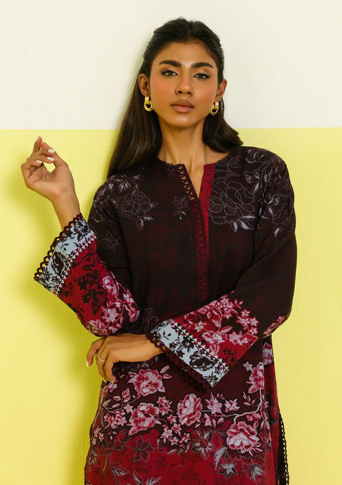 This striking two-piece features a deep purple base with a gradual transition into rich magenta , adorned with blooming floral motifs in shades of pink and light blue. The shirt is styled with a straight silhouette . Paired with matching trousers showcasing a complementing floral design.