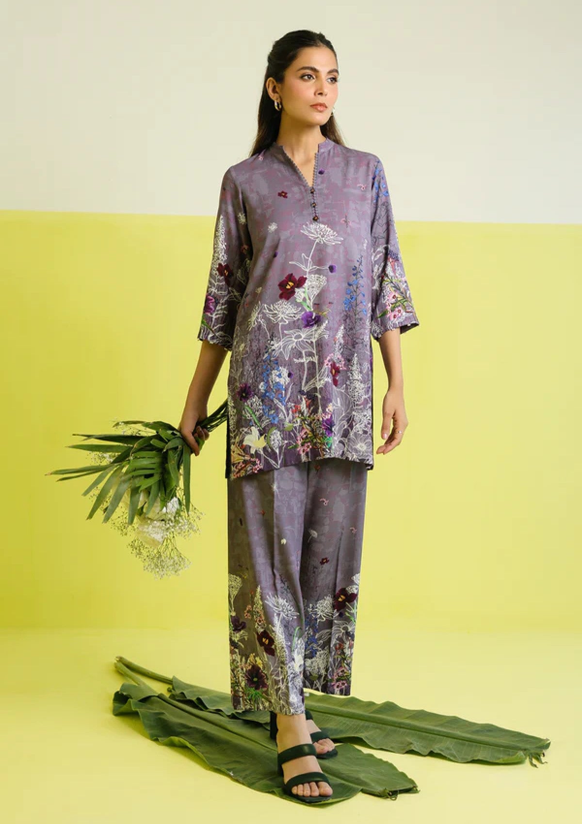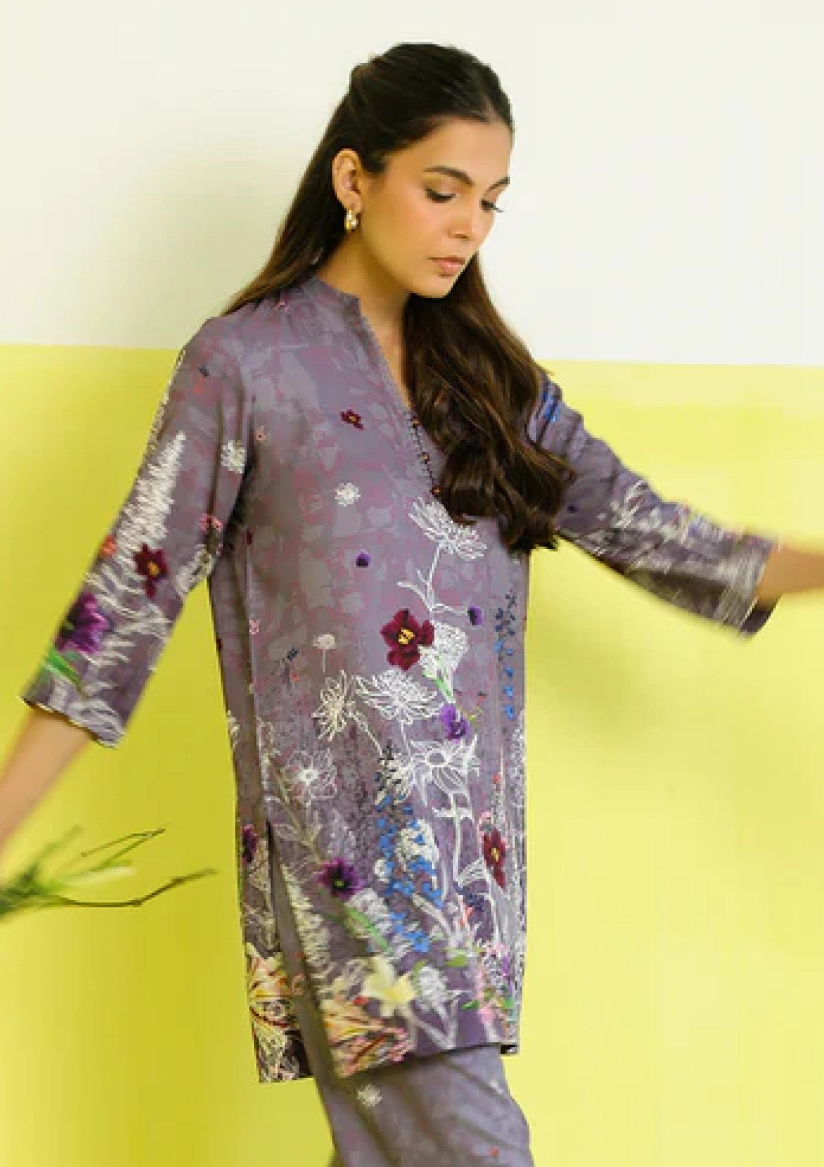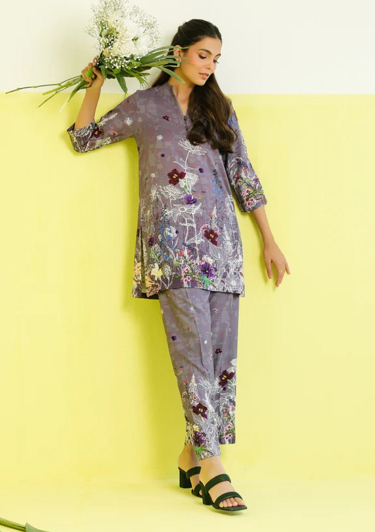 An enchanting Co-ord set in a soft lavender tone, enhanced with abstract floral artistry in hues of white, burgundy, and teal. The shirt features a relaxed, straight-cut silhouette with three-quarter sleeves, giving it a breezy yet modern vibe. Paired with trousers carrying similar printed botanical motifs.