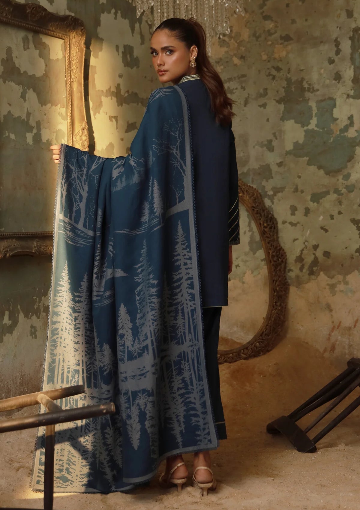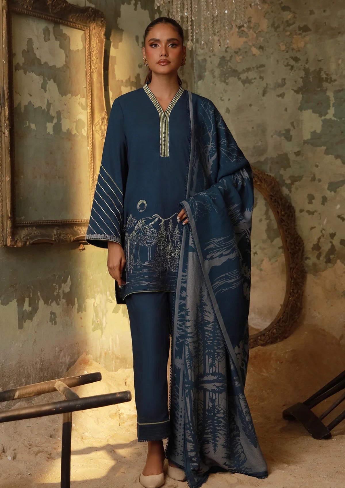 A navy blue suit featuring gradient-effect scenery embroidery on the daman and sleeves, evoking serene winter mountain landscapes. Paired with a soft grey and blue shawl, the look captures cool, alpine elegance—perfect for cozy, sophisticated winter wear.
