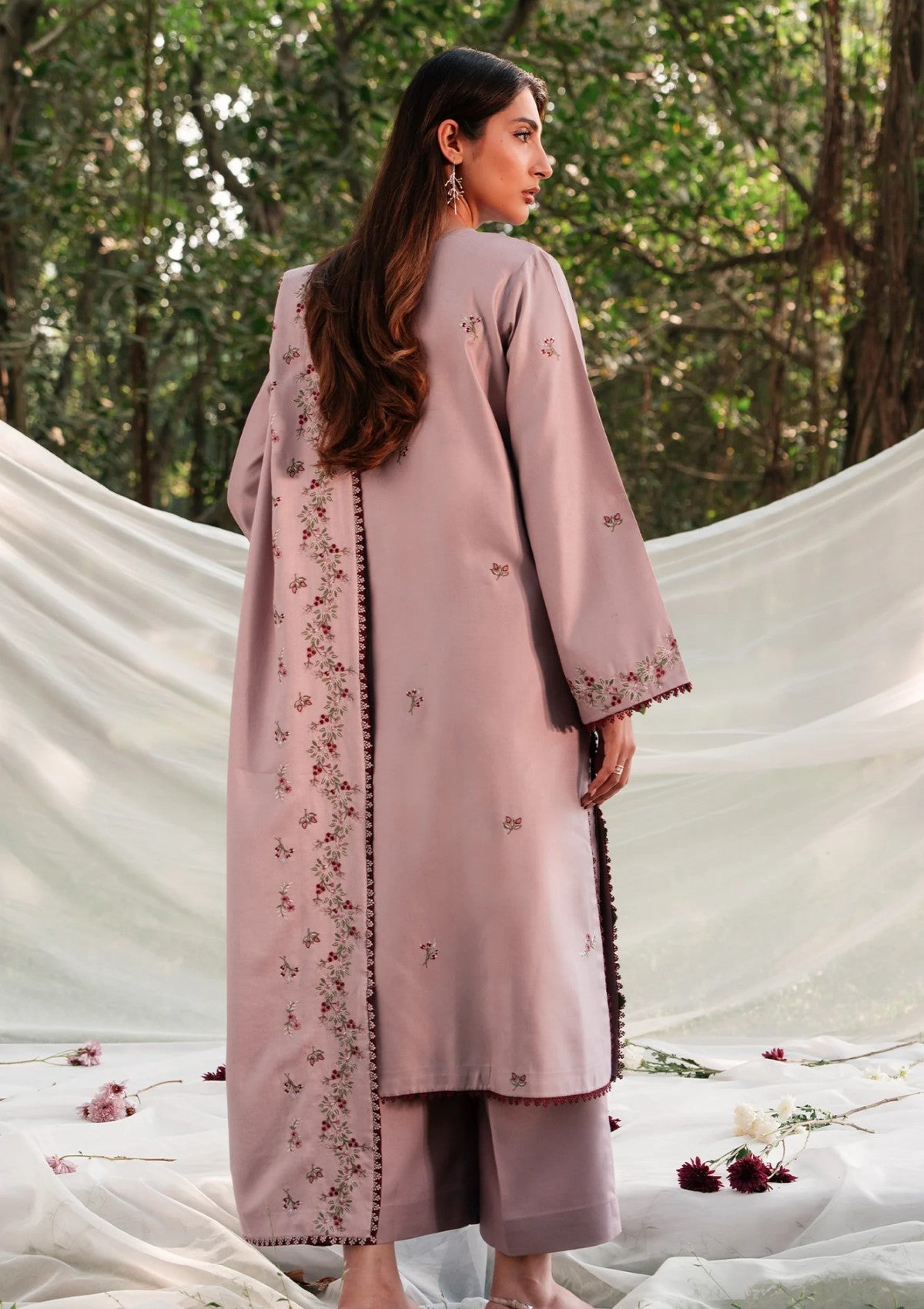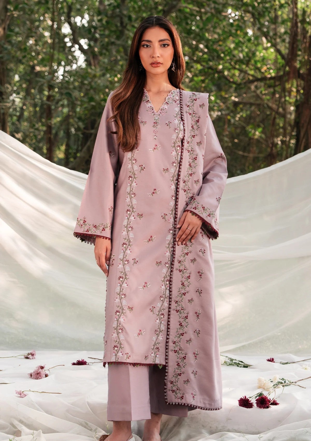In soft mauve tones, Elaris blooms with intricate resham embroidery in shades of crimson, rose, ivory, and moss green, delicately cascading along the shirt front and sleeves. The floral vines and scalloped detailing add depth and refinement, while the borders are framed with contrast maroon edging for a graceful finish. The shirt and trouser are crafted from viscose, paired with a blended embroidered shawl echoing the same romantic florals — radiating timeless femininity and serene winter charm.