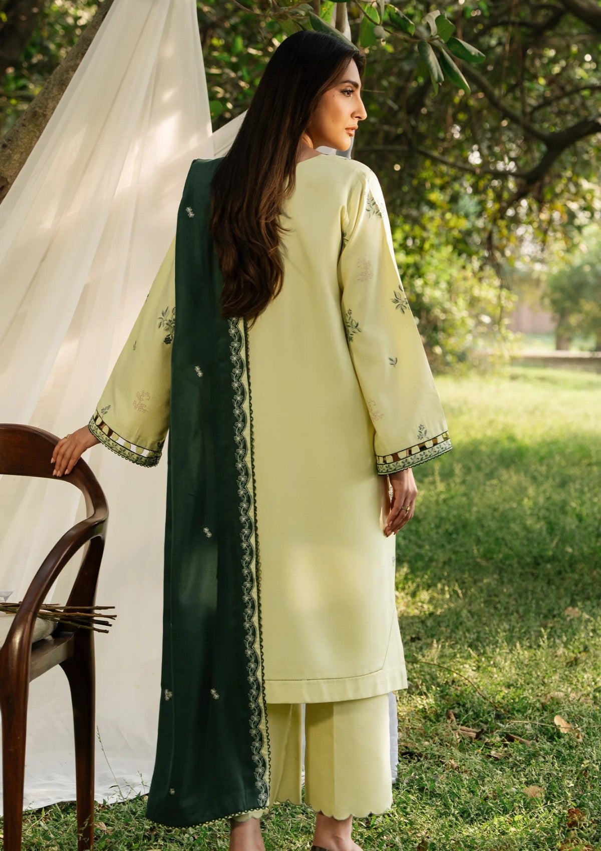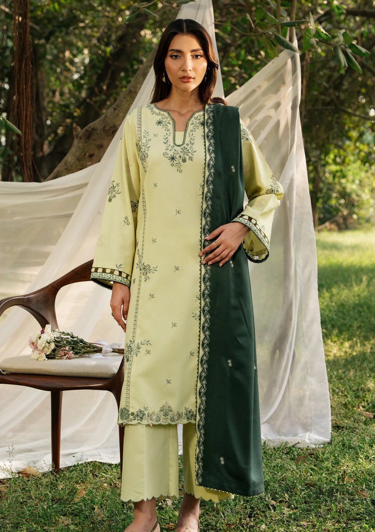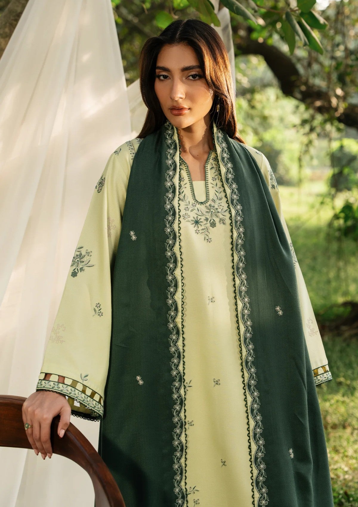 Soriel shines in a lime green canvas accentuated with delicate green and ivory embroidery forming botanical patterns across the shirt front and sleeves. The shirt and trouser are crafted from karandi, offering soft texture and warmth, while the moss-toned blended embroidered shawl — adorned with matching embroidered motifs — completes this graceful and refreshing winter look.